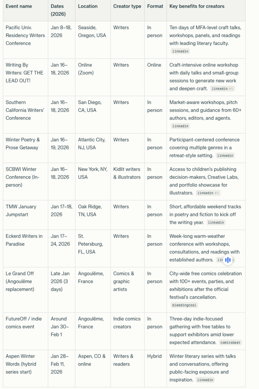 Here is an updated chart of major January 2026 events for writers, artists, comics creators, and kidlit illustrators.